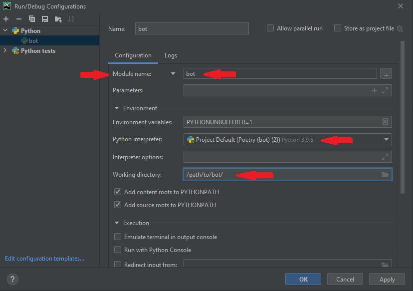 and set everything according to this image: - If using Visual Studio Code, set the interpreter to the poetry environment you created. In